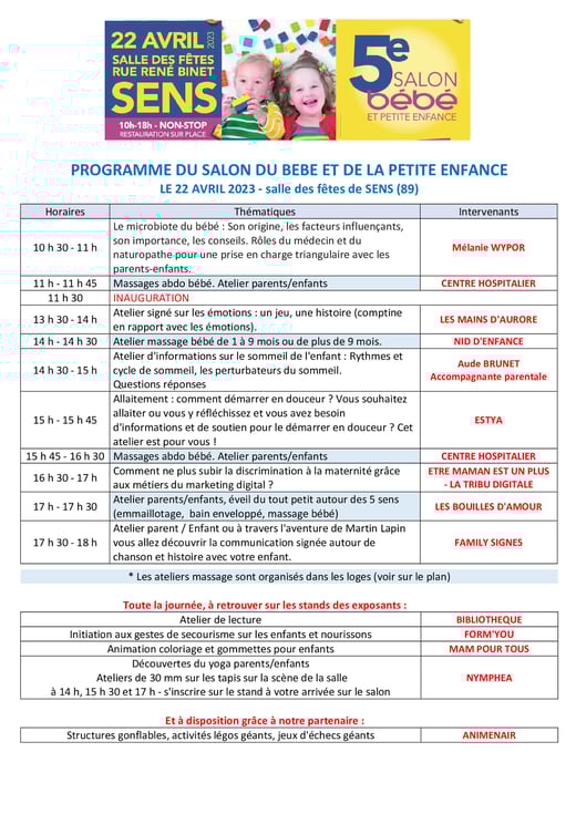 Le 5ème salon du bébé et de la petite enfance organisé par le Kiwanis Ycaunae de Sens se tient à la Salle des Fêtes de Sens (rue René Binet) le 22 avril 2023. Cet événement familial et convivial réunit de nombreux professionnels de la petite enfance que pourront rencontrer les parents, futurs parents, tatas, tontons et grands parents.